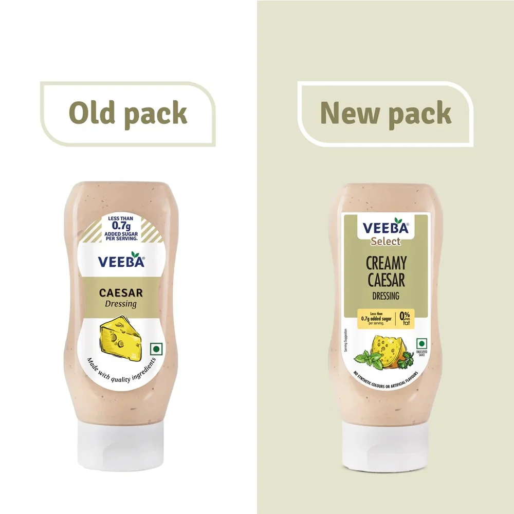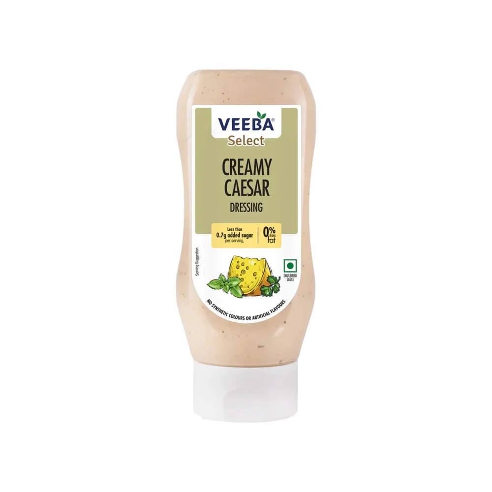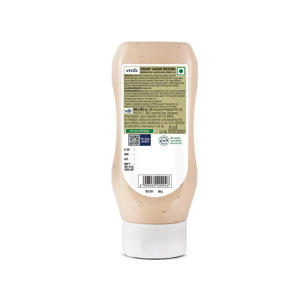 Veeba Caesar Dressing contains water, refined soyabean oil, synthetic vinegar, sugar, cheese, milk solids, salt, liquid glucose, herbs, spices and condiments.