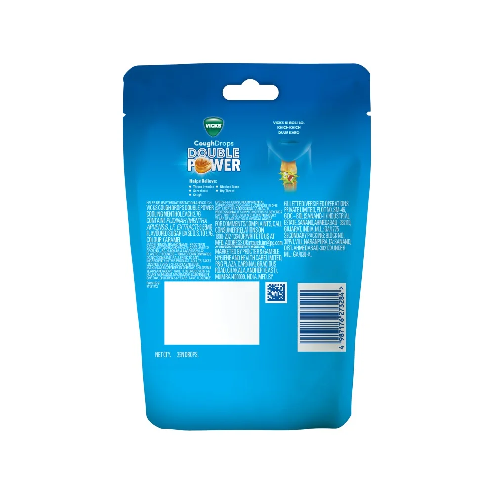Pudinah 4.750 mg, Flavoured Sugar Base q.s. to 2.0g and Caramel color, Vicks Cough Drops Honey 2.0g contains Pudinah 4.752 m, Flavoured Sugar Base q.s. to 2.0g and Caramel color, Vicks Cough Drops Ginger 2.0g contains Pudinah 4.000 mg, Flavoured Sugar Base q.s. to 2.0g and Caramel color