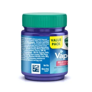 Vicks VapoRub contains Menthol, Camphor and Eucalyptus Oil, known for their therapeutic benefits in cough and cold relief. It provides effective multi-symptom relief from 6 symptoms- Blocked nose, Breathing difficulty, Cough, Body Ache, Headache & Muscular stiffness